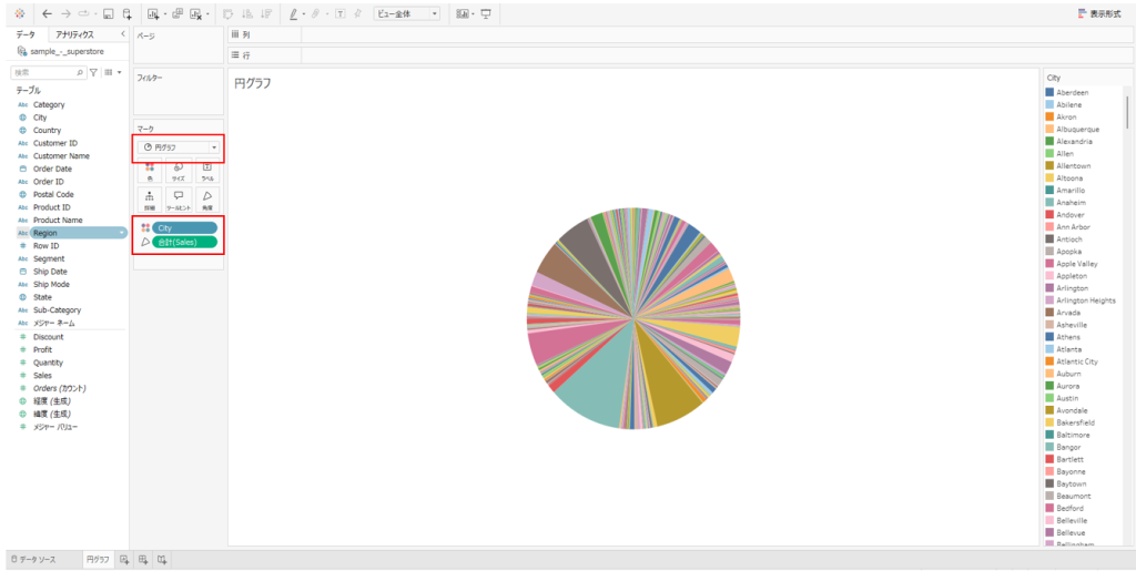 色に指定したディメンションごとに分割された円グラフを作成することができます。