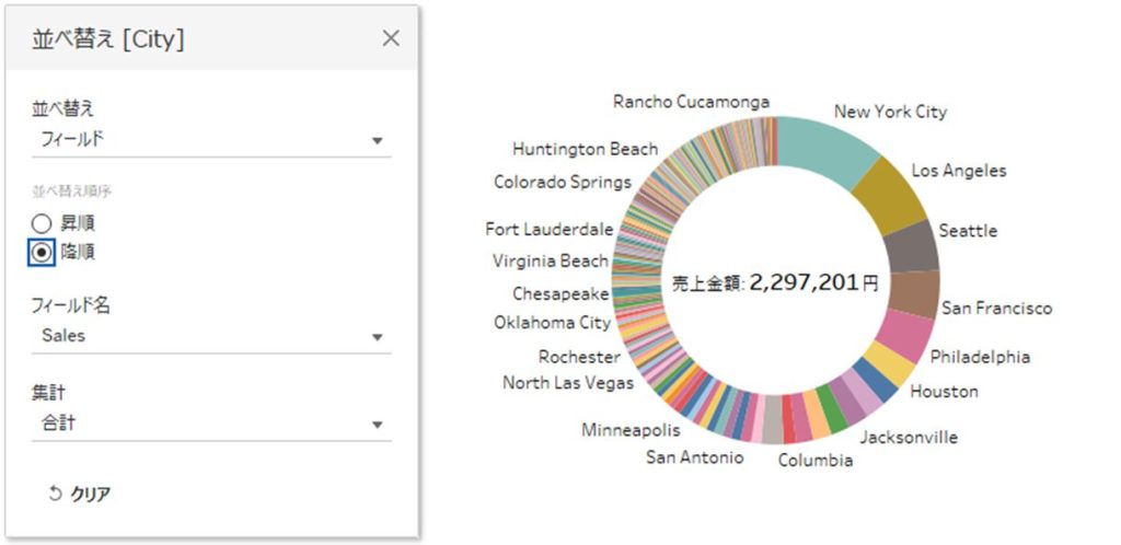 並び替えでフィールドを選択し、並び替えに選択したピル以外の項目で昇順・降順の指定ができます。