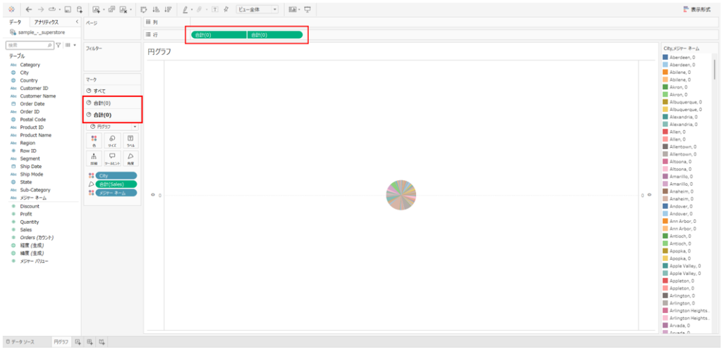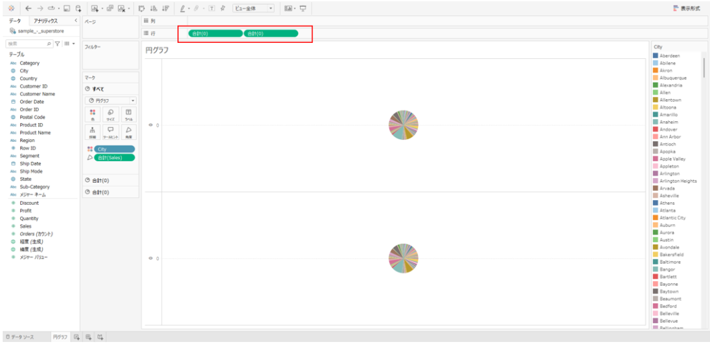 行シェルフをダブルクリックして0を入力し、[合計(0)]のピルを2つ作成します。
