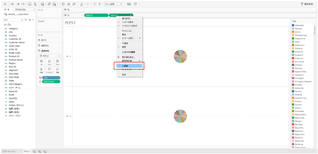 いずれかの[合計(0)]のピルを右クリックし、二重軸を選択してください。