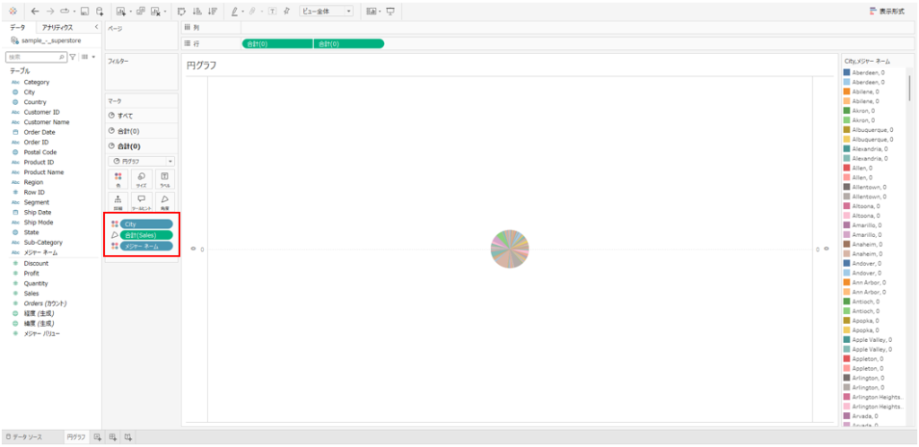 マークカードのグラフ種類で円グラフを選択し、データペインからディメンションを色に1つ、メジャーを角度に1つドラッグ&ドロップしてください。